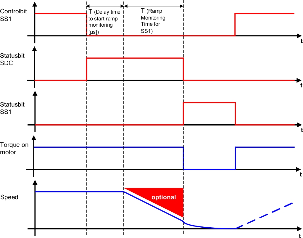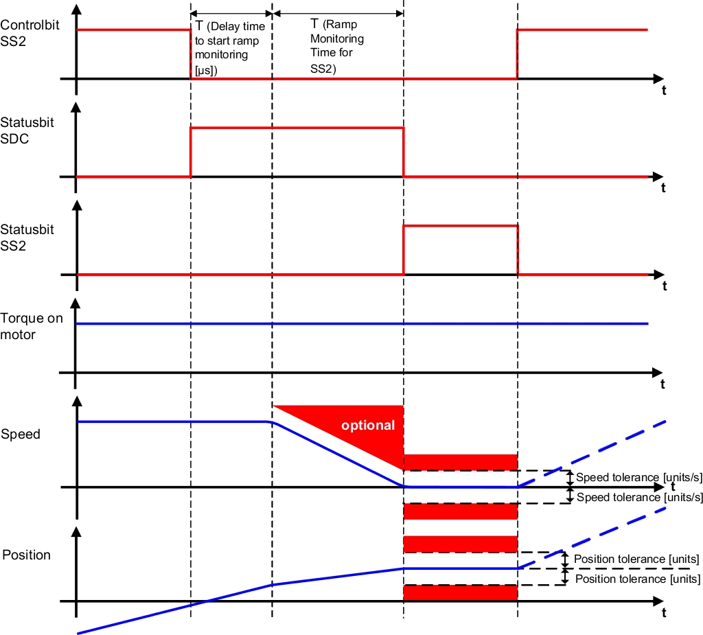As with SS1, it is possible to monitor either only the deceleration time or also the deceleration ramp depending on the requirements of the safety function. If a violation is detected during ramp monitoring or the subsequent standstill monitoring, safe pulse disabling is activated immediately and an error state requiring acknowledgment is triggered.