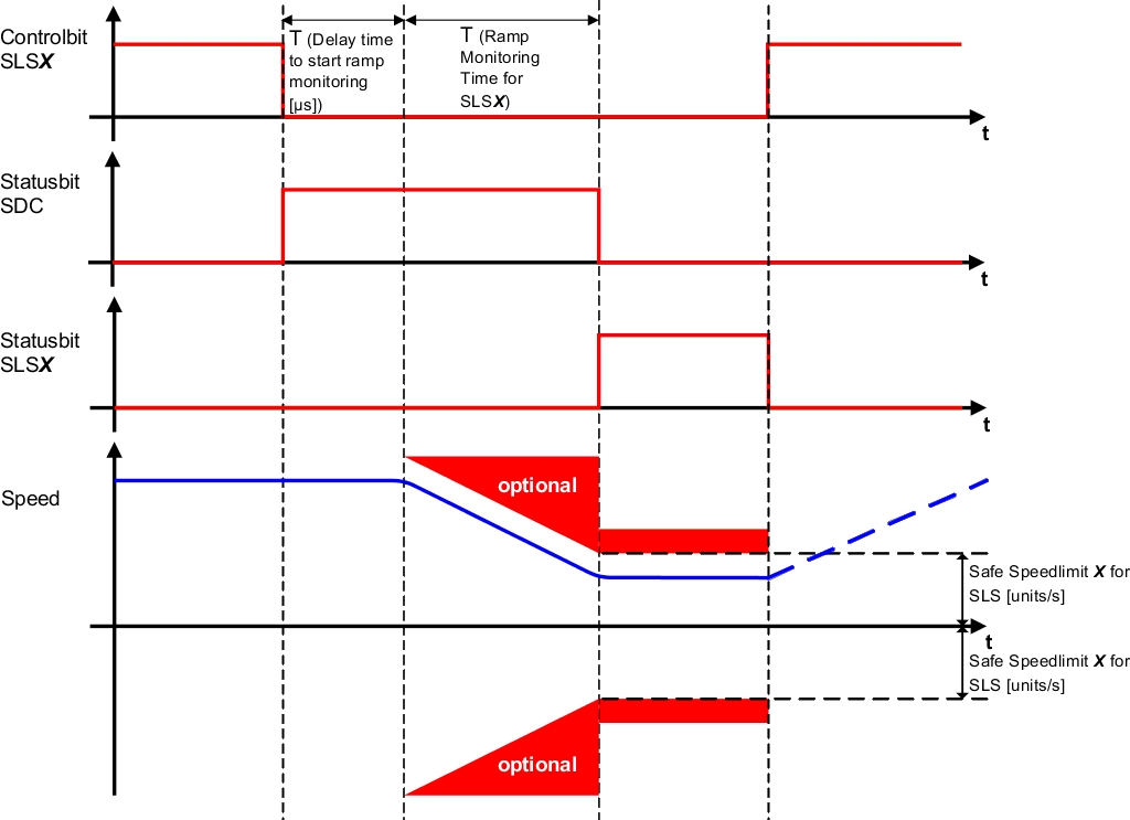 The difference between SMS and SLS is that SMS cannot be actively requested. It is either enabled or disabled by the configuration. When enabled, the current speed is constantly monitored against a defined limit. If the limit is exceeded, safe pulse disabling is activated immediately and an acknowledgeable error state is triggered.