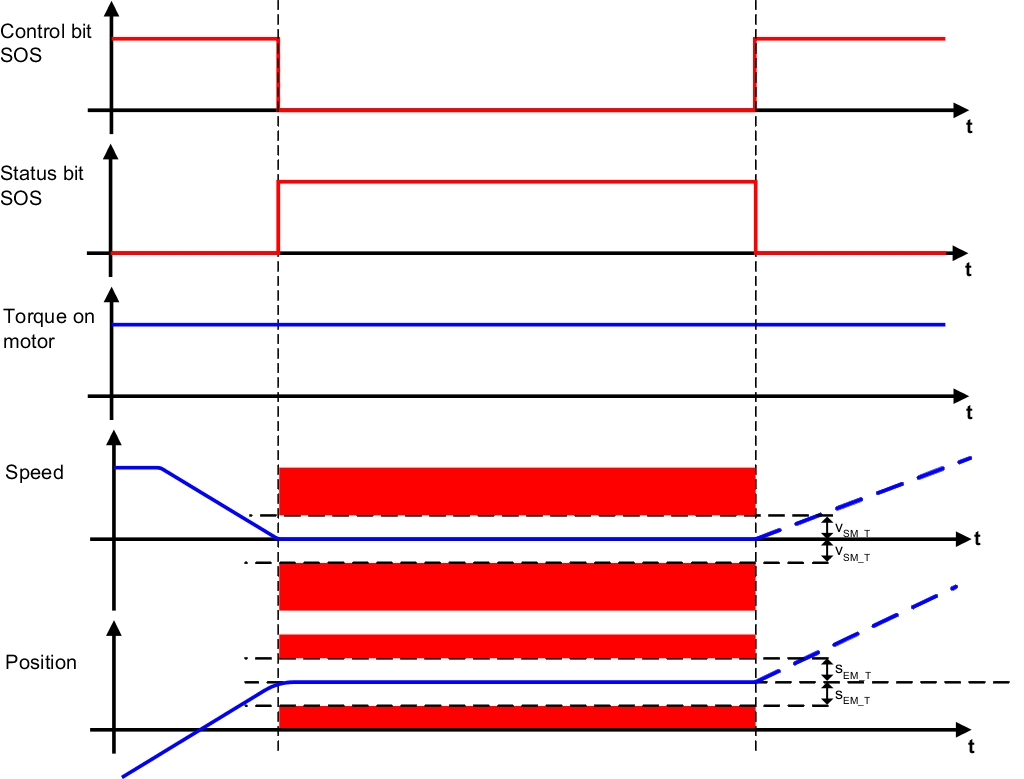 Safe Operating Stop (SOS) is the state in which the drive is monitored for coming to a safe stop. The drive is supplied with power and can therefore generate torque and force. All control functions between the electronic controller and the drive motor are active. The axis standstill is monitored using a configurable standstill tolerance window. Both the position as well as the speed are monitored. In order to collect the speed and position data in a safe manner, a suitable safety encoder is required. If the standstill monitoring limits are violated, safe pulse disabling is activated immediately and the drive switches to an error state that must be acknowledged.