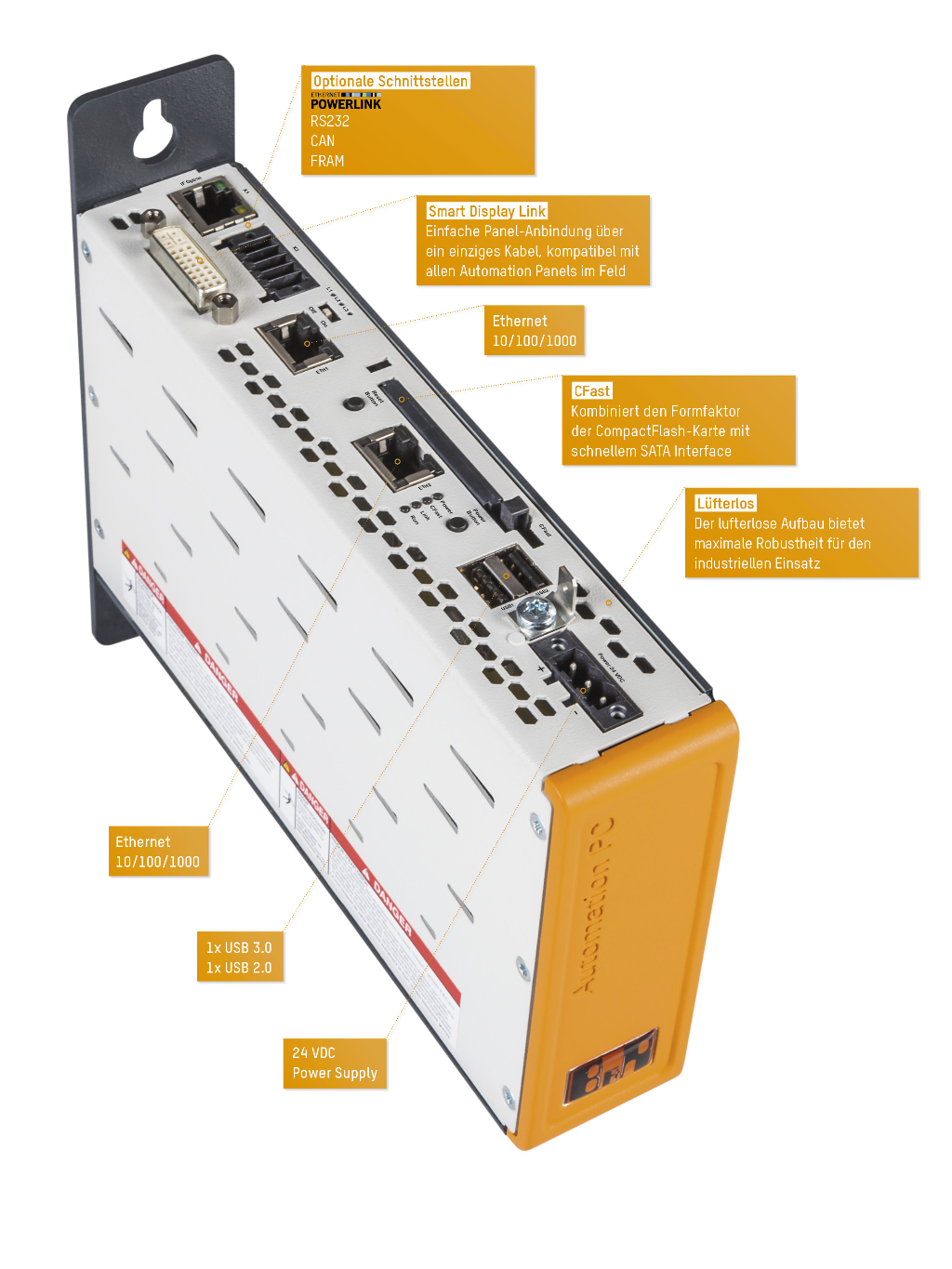 Beim Automation PC 2100 sind alle wichtigen Schnittstellen integriert. Dazu zählen 2x Gigabit Ethernet, je 1x USB 2.0 und USB 3.0. Des Weiteren können Feldbusse wie POWERLINK und CAN über modulare Schnittstellenmodule ausgeführt werden. Als Datenträger kommt die kompakte CFast-Karte zum Einsatz, die auf MLC-Basis auch mit 60 GB und mehr zur Verfügung steht.