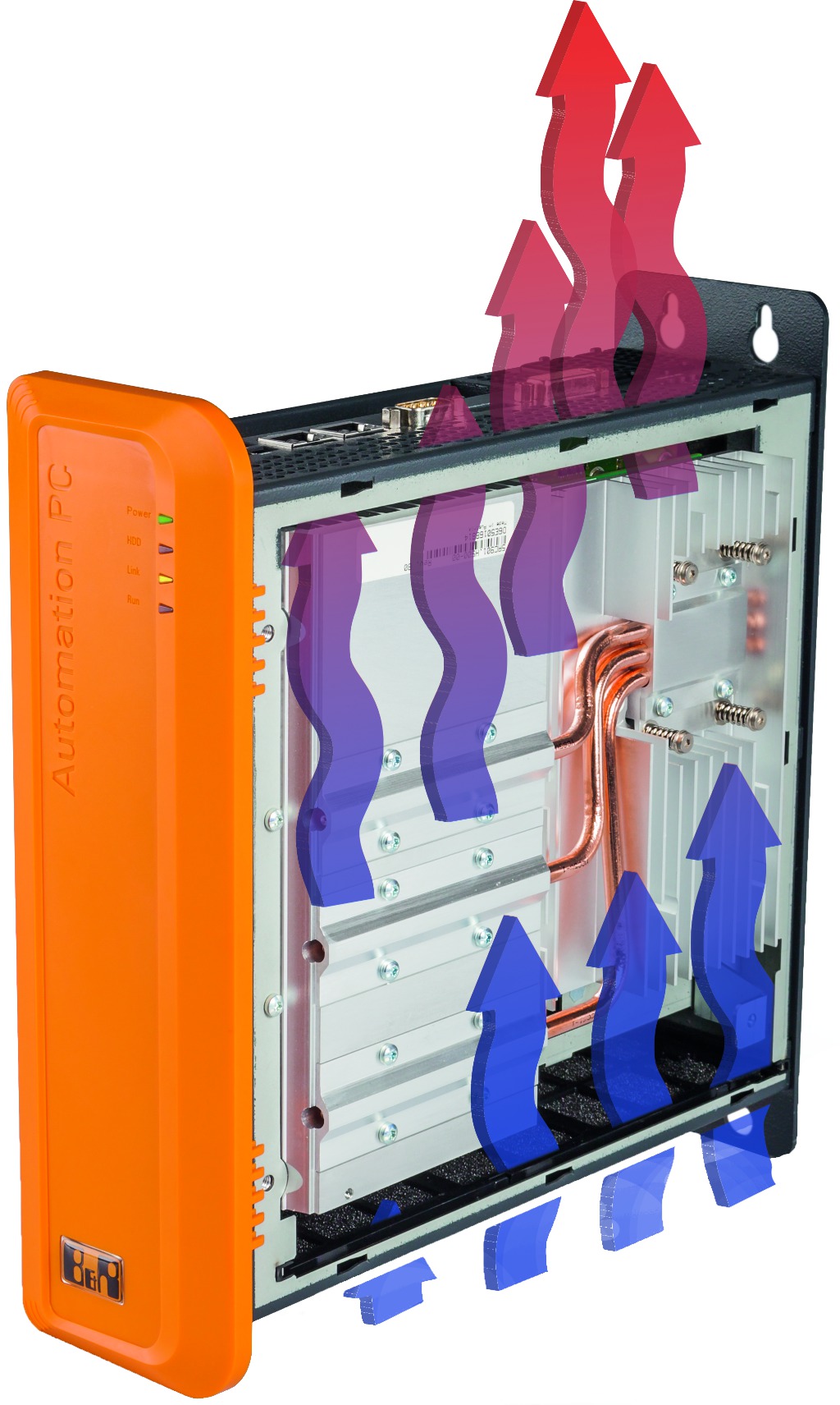 Ausgewählte Prozessoren kommen ohne Lüfter aus. Dabei erzielt der Automation PC 910 Performance-Ergebnisse, die bei früheren PC-Generationen nur mit Lüftern erzielt werden konnten. Im High-Performance- Segment können beim Betrieb mit Lüfter sogar Quad-Core-Prozessoren zum Einsatz kommen – mit Performance-Werten, die für derart kompakte PC-Bauformen bisher undenkbar waren. Dabei wird ein zielgerichteter Luftstrom durch die integrierten Kühlrippen geführt.