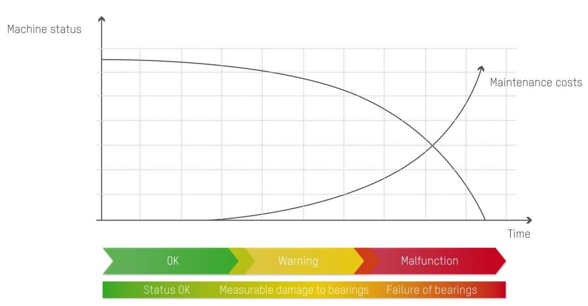 Vibrationen sind nichts Anderes als Schwingungen, die in einem bestimmten Frequenzbereich auftreten. Steigt in einem spezifischen Frequenzbereich eine Amplitude an, ist das bei richtiger Parametrierung des Condition-Monitoring-Systems ein Hinweis auf einen sich anbahnenden Defekt. Die Höhe der Spitze lässt Rückschlüsse auf den Fortschritt des Schadens zu. Vibrationen erzeugen also Informationen, die darauf hinweisen, wann ein Teil ausgetauscht werden sollte.