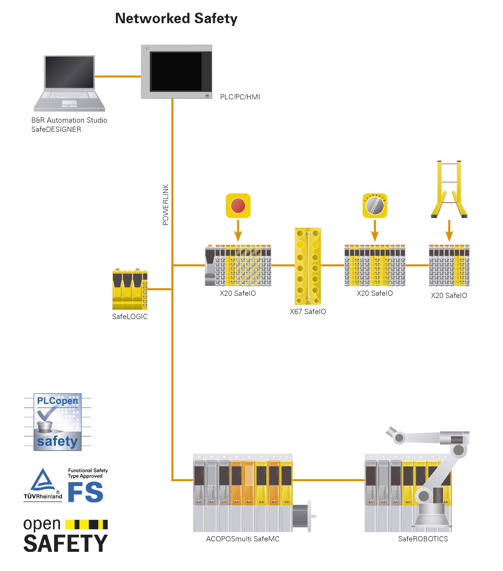 Als Kommunikationsprotokoll setzt B&R auf den offenen Sicherheitsstandard openSAFETY. Er ist als Open Source verfügbar. Sensor- und Komponentenhersteller profitieren davon, dass sie lediglich die eigentliche Funktion des sicheren Sensors oder der sicheren Komponente zertifizieren müssen. Außerdem ist openSAFETY im Gegensatz zu allen anderen Safety-Protokollen an keinen Feldbus gebunden. Die Datenpakete sind in sich sicher und können somit über jeden beliebigen Datenkanal transportiert werden. Der Endkunde kann seinen bevorzugten Feldbus verwenden und trotzdem Produkte von verschiedenen Herstellern beziehen.