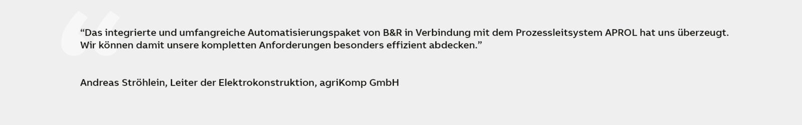 AgriKomp erstellte einen 75-seitigen Katalog mit über 100 Anforderungskriterien und holte Angebote von namhaften Automatisierungsanbietern ein. Am Ende der Evaluierung erhielt B&R den Zuschlag. „Das integrierte und umfangreiche Automatisierungspaket von B&R in Verbindung mit dem Prozessleitsystem APROL hat uns überzeugt. Damit können wir unsere gesamten Anforderungen besonders effizient abdecken“, erklärt Ströhlein. „Wichtig war uns, dass das Paket eine integrierte Sicherheitstechniklösung enthält und die Schnittstellen vorbildlich unterstützt werden. Auf B&R-Seite gibt es für jede physikalische Schnittstelle das passende Gegenstück. Ein zentrales Kriterium war auch, dass sich die B&R-Steuerungslösung problemlos skalieren lässt.“