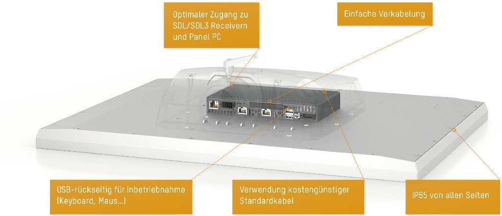 Alle Automation Panels 5000 können mit dem Panel PC 2100 zum vollwertigen PC-System werden, da dieser nicht größer ist als der Smart Display Link. Die Verkabelung der Ethernet- und Feldbus-Schnittstellen gestaltet sich sehr anwenderfreundlich, da alle Schnittstellen optimal zugänglich angeordnet sind.