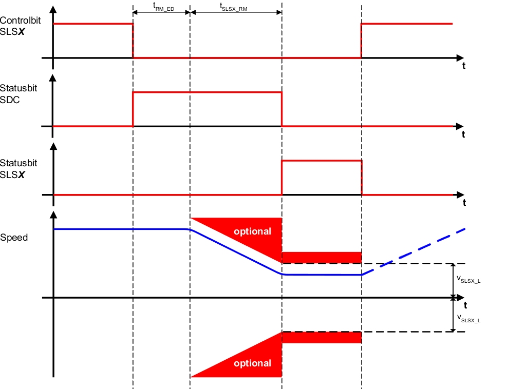 Bei der Sicherheitsfunktion SLS wird der Antrieb auf die Einhaltung parametrierbarer Geschwindigkeitsgrenzwerte überwacht. Je nach Anwendung kann zuvor auch noch die Verzögerung bis zum Erreichen des Limits überwacht werden. Die Überwachung der Verzögerungsrampe ist je nach Anforderung so einstellbar, dass entweder nur die Verzögerungszeit oder aber auch zusätzlich die Verzögerungsrampe überwacht wird. Wird während der Verzögerung oder der Überwachung des Geschwindigkeitslimits eine Verletzung erkannt, so wird sofort die sichere Impulssperre aktiviert und ein quittierbarer Fehlerzustand eingenommen.
