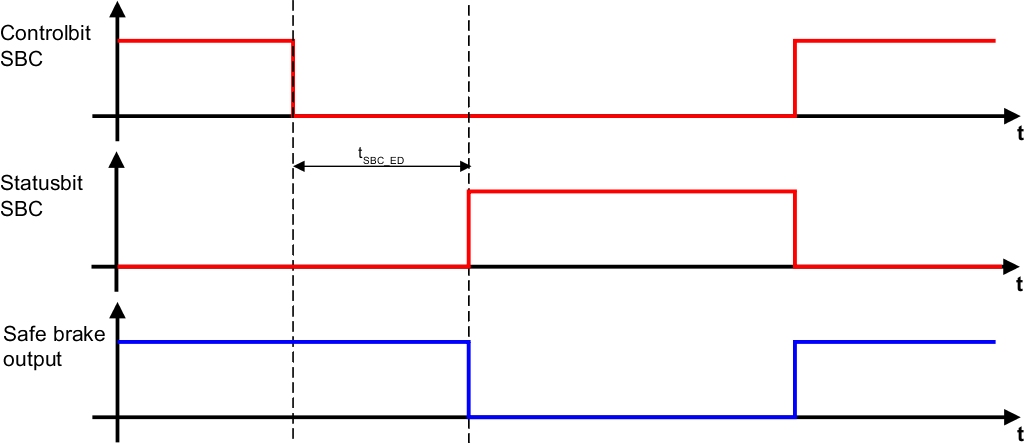 Die sichere Bremsenansteuerung (SBC) liefert ein sicheres Ausgangssignal zur Ansteuerung einer externen Bremse. Die integrierte Sicherheitsfunktion SBC kann entweder explizit durch die SafeLOGIC oder durch das Auftreten eines Modulfehlers angefordert werden. Abhängig von der Qualität der angeschlossenen Bremse und deren Verkabelung, erfüllt die Funktion SBC SIL 2 nach EN 61508.