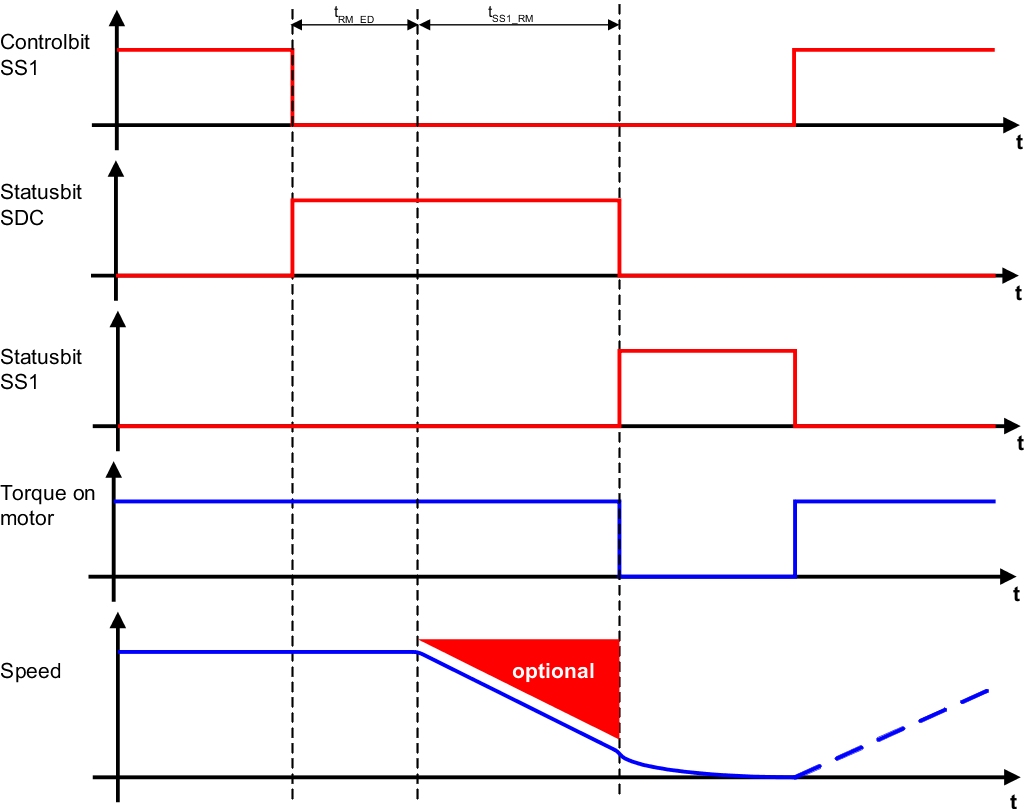 Beim sicheren Stillstand 1 (SS1) wird die Überführung eines in Bewegung befindlichen Motors in den Stillstand sicher überwacht. Am Ende der Verzögerung wird die sichere Impulssperre aktiviert und der Antrieb somit drehmoment- und kraftfrei geschaltet. Je nach Anforderung an die Sicherheitsfunktion wird entweder nur die Verzögerungszeit oder aber zusätzlich auch die Verzögerungsrampe überwacht. Tritt während des Verzögerungsvorgangs eine Verletzung der Überwachung auf, so wird sofort die sichere Impulssperre aktiviert und ein quittierbarer Fehlerzustand eingenommen. Die Überwachung der Verzögerungsrampe bietet den Vorteil, dass sich im Fehlerfall der anzunehmende Restweg bis zum Stillstand verkürzt.