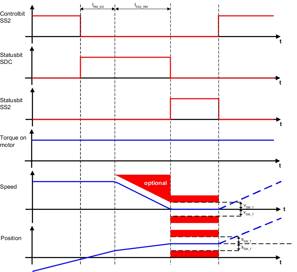 Beim sicheren Stillstand 2 (SS2) wird die Überführung eines in Bewegung befindlichen Motors in den Stillstand sicher überwacht. Danach muss der Antrieb durch die funktionale Applikation im Stillstand gehalten werden. Dieser Stillstand wird, wie bei SOS, durch das SafeMOTION-Modul entsprechend dem dafür konfigurierten Stillstandstoleranzfenster überwacht.