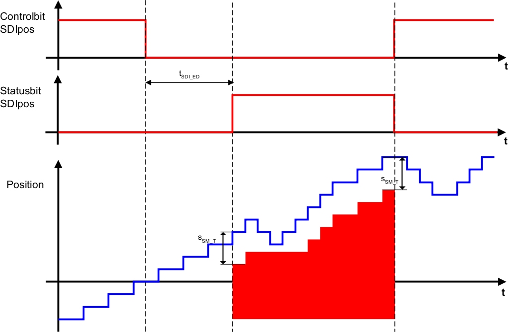 Bei der Anforderung der Funktion muss sich die sichere Achse im Stillstand befinden. Danach wird ein Positionsfenster gebildet, welches dann sicher überwacht wird. Dieses Positionsfenster ist abhängig vom parametrierten sicheren Schrittmaß.