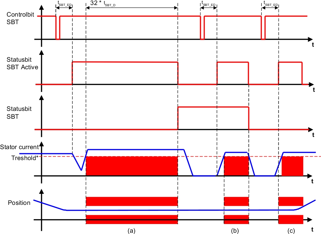 Die Sicherheitsfunktion SBT (Safe Brake Test) bietet die Möglichkeit, eine eingefallene Bremse mit einem konfigurierbaren Statorstrom und einer bestimmten Dauer zu testen.