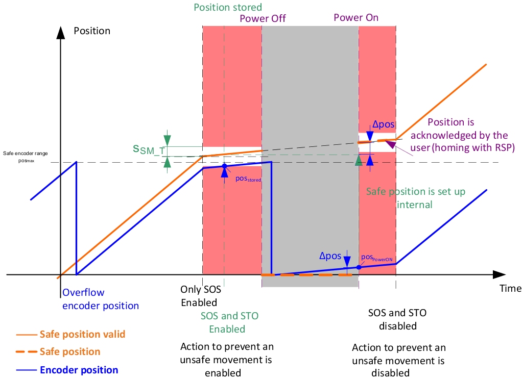 Das Speichern von gültigen Positionsdaten ist nur nach kontrolliertem Stillstand des Antriebs möglich, daher muss der Stillstand gewährleistet werden. Zusätzlich muss gesichert sein, dass während des Speichervorgangs keine Energiezufuhr und somit eine Bewegung des Antriebs nicht möglich ist. Diese Anforderungen werden durch die Sicherheitsfunktionen STO und SOS sichergestellt.