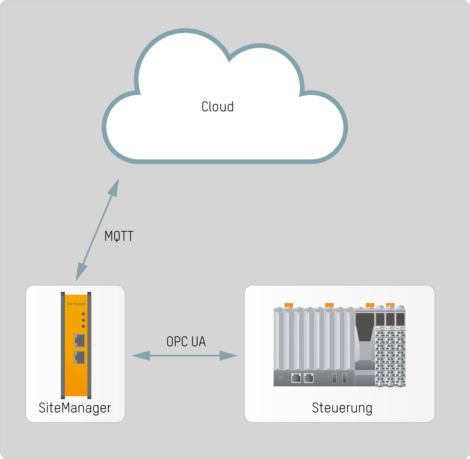 Der B&R-SiteManager ermöglicht außerdem das sichere Übertragen von Daten in die Cloud. „Dazu verbindet sich der SiteManager mit der Steuerung der Maschine über OPC UA und überträgt die Daten mit dem Nachrichtenprotokoll MQTT in die Cloud“, erklärt Blaschke. Der Anwender definiert bei der Konfiguration, welche Daten übertragen werden sollen. Es ist auch möglich, unterschiedliche Daten an unterschiedliche Cloudanbieter zu übertragen. Die Konfiguration erfolgt auf einfache Weise in der Weboberfläche des SiteManagers.