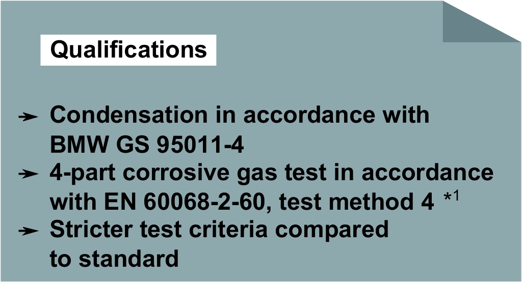 The coating on the electronics module protects the components and circuit board from the effects of condensation. The effectiveness of protection against condensation is checked using the test specified in BMW GS 95011-4, and protection against corrosive gases using the 4-part corrosive gas tests specified in EN 60068-2-60, test method 4. The tests are completed both in the company testing lab, which is accredited in accordance with EN ISO/IEC 17025:2007, and at certified external testing facilities. There, the products undergo further testing to check their durability – even beyond standard requirements.