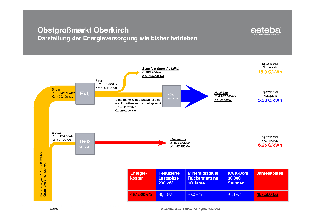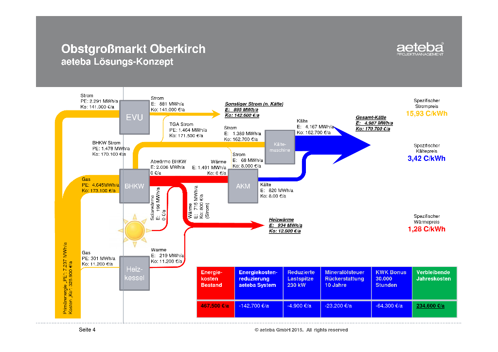 The wholesale fruit market in Oberkirch has been using this solution to control the new energy supply system implemented by aeteba, which is built around a combined heat and power unit with electrical and thermal capacities of 200 and 256 kilowatts, respectively. For economic reasons, the system was designed to cover 80% of the facility's total electricity requirements. Electricity generated in-house is used almost exclusively to operate the chiller (1,389 megawatt hours or €162,700 per year), leaving only 881 megawatt hours to be purchased from the utility provider. Additional cooling energy (820 megawatt hours) is provided by an absorption refrigerator that utilizes waste heat from the combined heat and power unit. Supplemental power for the heating and cooling systems is provided by 409 square meters of solar panels (219 megawatt hours) and a small gas boiler (219 megawatt hours).