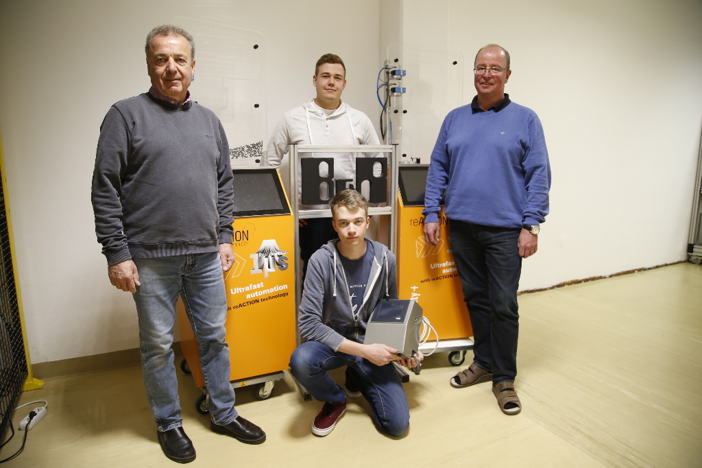 Students Lukas Brünner and Alexander Brader present their WaterStop together with their supervisors.