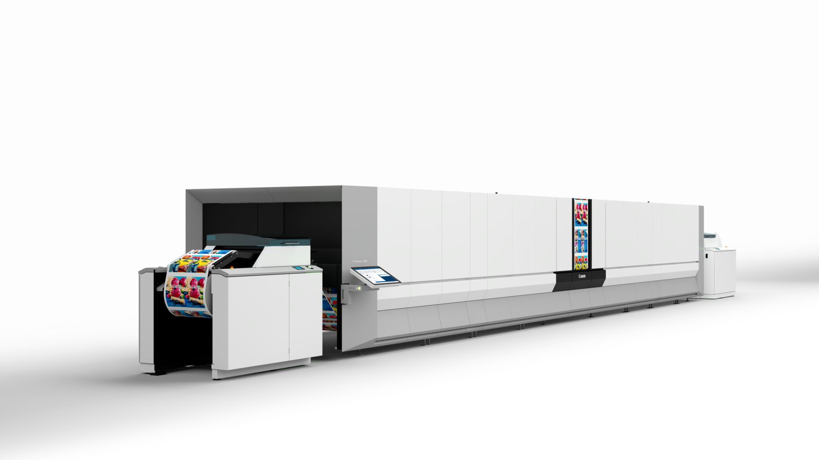 It was also the first member of the Canon portfolio to feature a B&R hardware platform for web control. The B&R system controls five servo motors, which drive the rollers that maintain the required web tension as they move the paper through the machine. One of the most difficult challenges to solve when working with coated paper is web tension control, due to the smooth surface.