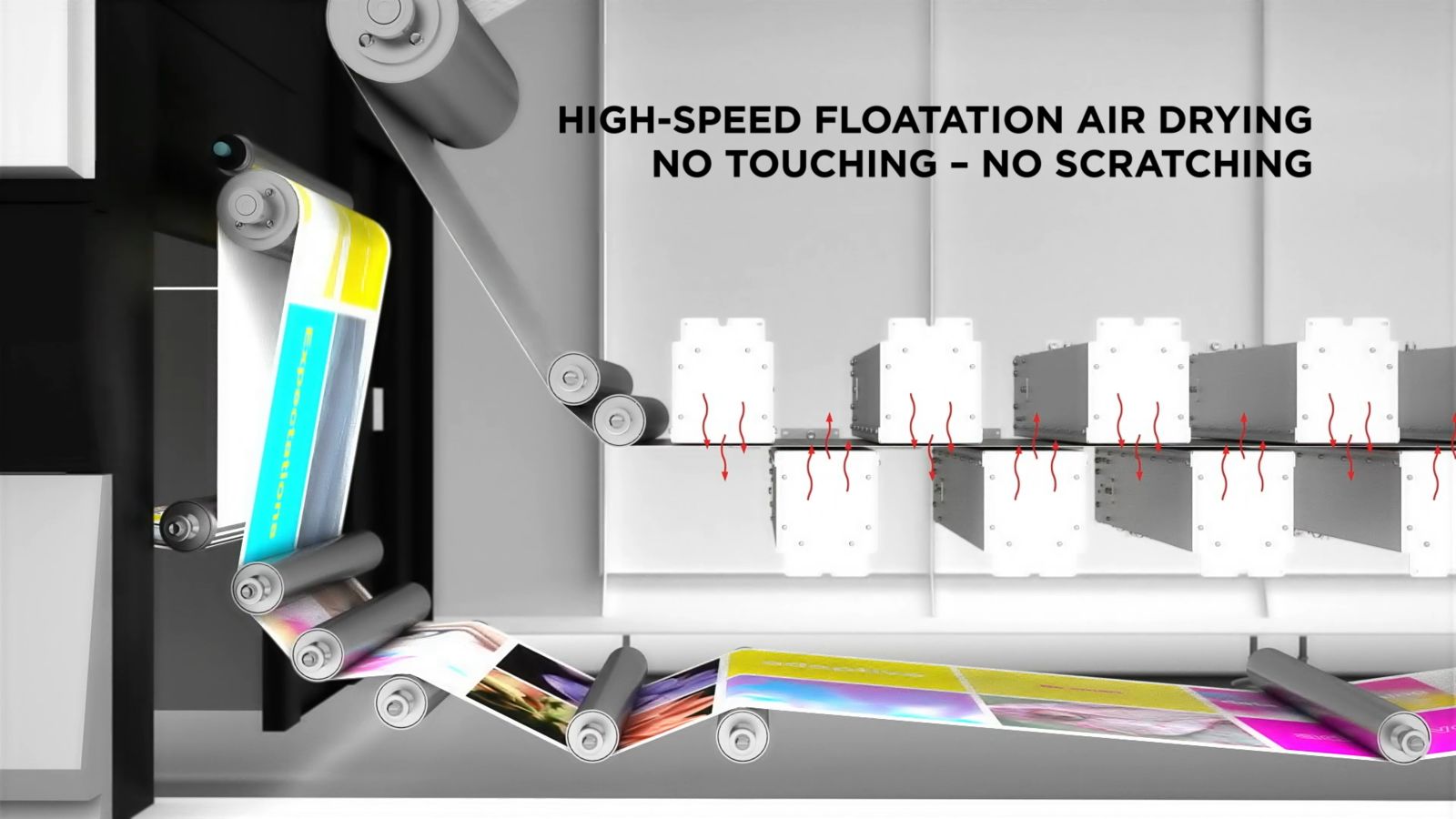 To meet this requirement profile, the Canon developers had to dig deep into their proverbial toolbox. In addition to a novel polymer ink technology and an optimized no-contact air drying system, the solution also makes use of state-of-the-art print heads and a high-performance web control system.