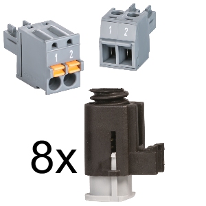 Installation kit for Power Panel T-Series: 8 retaining clips with torque limiting, 1x 2-pin cage clamp terminal block (0TB6102.2110-01), 1x 2-pin screw clamp terminal block (0TB6102.2010-01). |