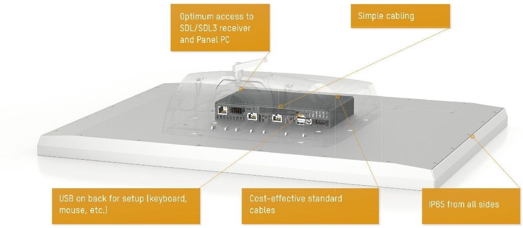 Todos los dispositivos Automation Panel 5000 pueden actualizarse a un sistema de PC plenamente operativo mediante la incorporación de un Panel PC 2100, que no es más grande que un receptor Smart Display Link. Conectar cables a la interfaz de Ethernet y al de bus de campo también es muy fácil, puesto que se puede acceder a ellos fácilmente.