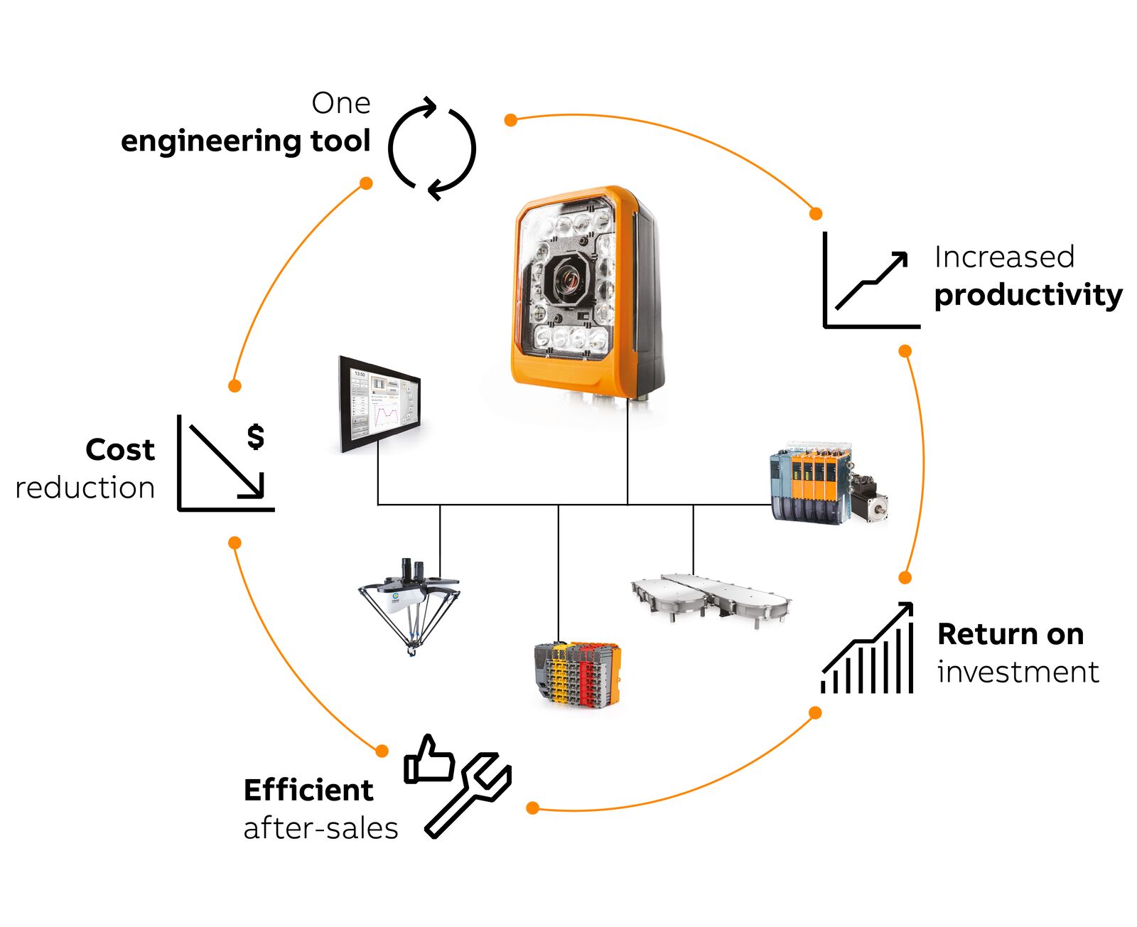 La profundidad de integración sin precedentes del sistema de visión de B&R abre nuevas posibilidades que van mucho más allá de la inspección de calidad. La información se puede entregar a los lazos de control en tiempo real para poder proporcionar un control avanzado de la máquina. Ello permite un comportamiento determinístico del sistema que conduce a unos tiempos de inactividad de la máquina mínimos y, en definitiva, a una eficacia general de los equipos máxima. La gestión centralizada de datos permite un diagnóstico detallado y un mantenimiento sencillo.