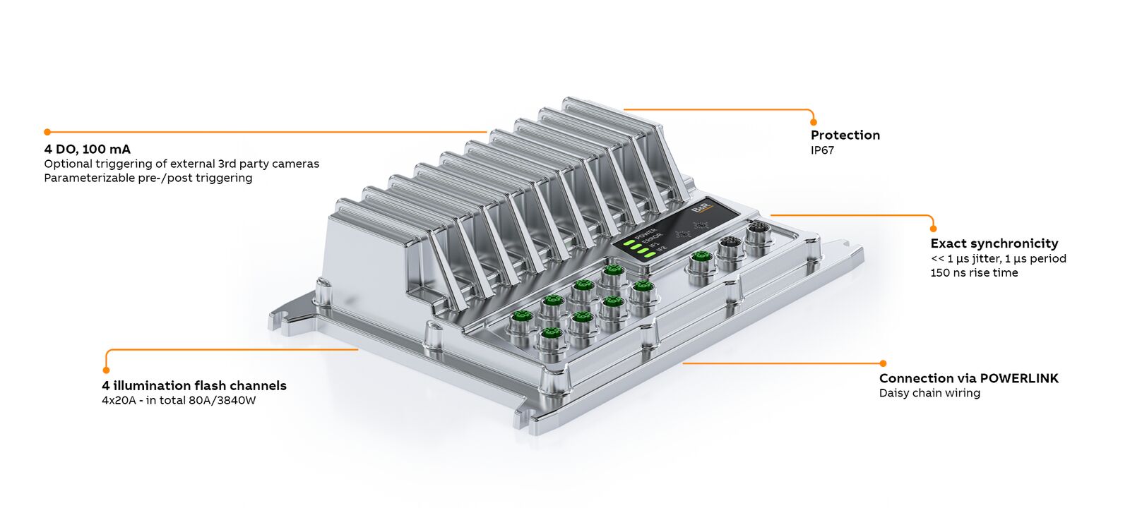 Con el Flash Controller de B&R, cualquier sistema de iluminación externo accionado por corriente funciona como si fuera una Smart Light de B&R integrada. Este sistema ofrece conexiones de un solo cable sin necesidad de sensores de disparo adicionales. Ofrece una sincronización con precisión de µs a todo el sistema de B&R, tiempos de subida de la corriente de destello increíblemente rápidos y la máxima potencia durante todo el periodo de destello. Además, se ahorran costes gracias a la reducción del espacio en armario, el menor número de cables y la menor longitud de los mismos.