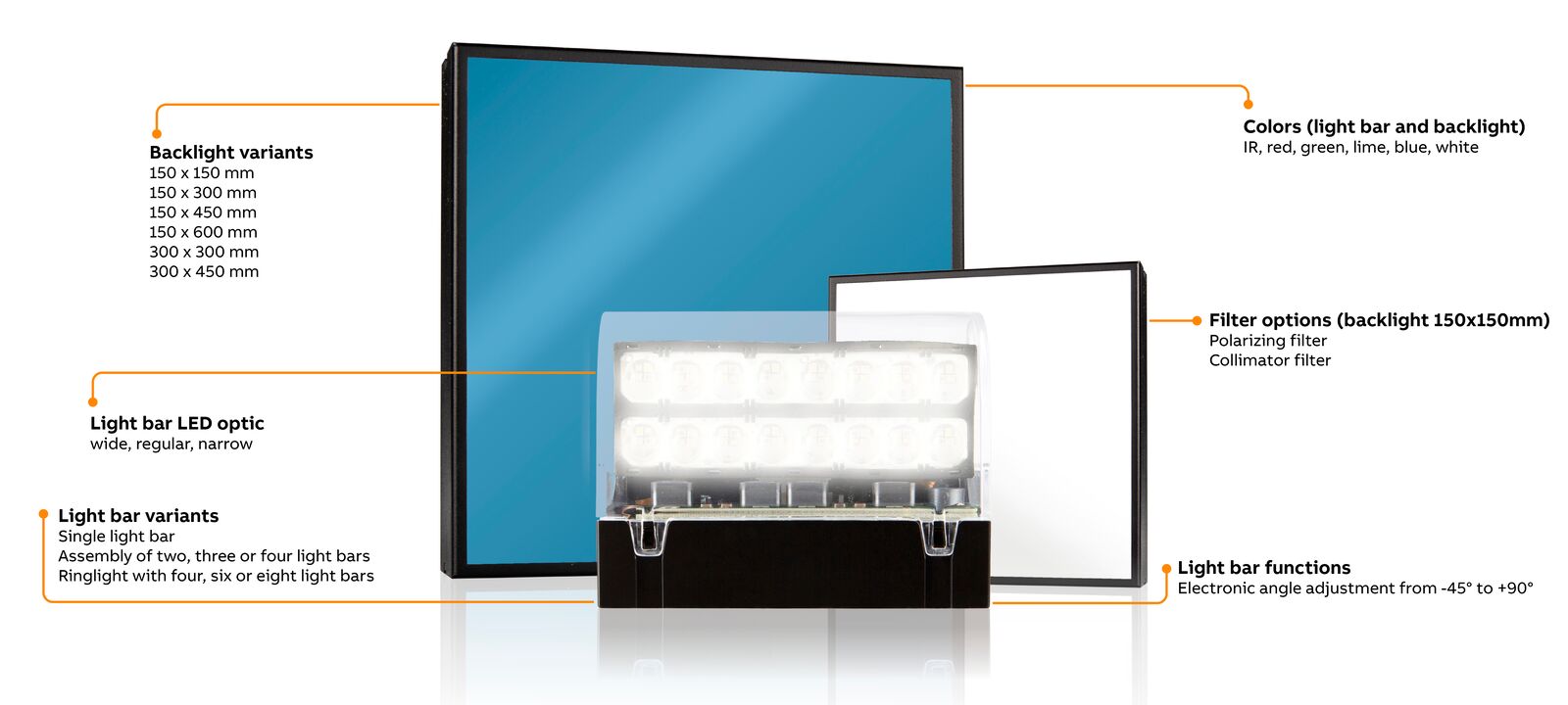 - Disponible como iluminación integrada en la cámara o como retroiluminación inteligente externa, barra de luz o luz anular