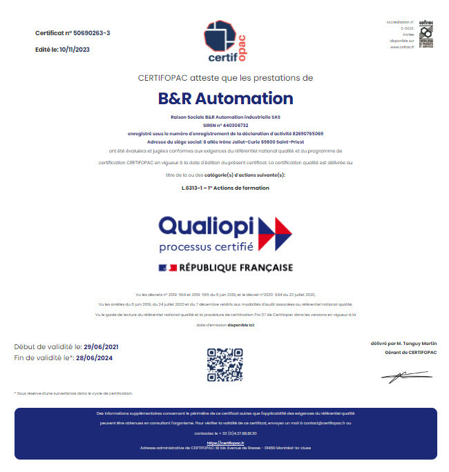 B&R Automation est certifié Qualiopi. Cette certification atteste la qualité de nos actions de formation et rend nos formations éligibles au financement par un OPCO. Nous fournissons tous les documents nécessaires pour la constitution du dossier de prise en charge.