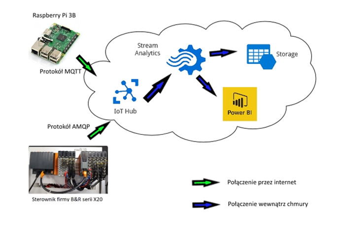 Układ automatyki stworzony z elementów użyczonych przez firmę B&R miał sterować procesem ogrzewania, zbierać dane z układu do pliku CSV, generować raporty, alarmować o stanach niepożądanych, a także zmieniać nastawy regulatora wykorzystując wcześniej zapisane wartości. Wszystko to miało być ukazane na panelu operatorskim, który w intuicyjny sposób pozwalałby na szybkie i łatwe nadzorowanie procesu. Dane archiwizowane lokalnie przesyłano do platformy chmurowej Azure IoT Hub z wykorzystaniem protokołu AMQP, a następnie do innych usług, które umożliwiają ich wizualizację (m.in. Power BI). Dzięki takiemu rozwiązaniu możliwe było nadzorowanie pracy układu automatyki niezależnie od jego geograficznej lokalizacji. Projekt obejmował także wykonanie drugiego systemu sterowania opartego o inne technologie (Arduino, Raspberry Pi, protokół MQTT). Kontrolował on również proces ogrzewania, przez co możliwe było porównanie danych przesłanych do chmury dla obu stanowisk. Takie rozwiązanie pozwala na analizę pracy i integrację z istniejącymi już maszynami. W projekcie zastosowano technologie MpRecipe, MpData, MpOEE, MpReport oraz bibliotekę AzureSDK.
