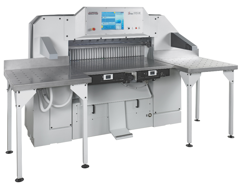 The cutter bar glides gracefully through a stack of paper centimeters thick, leaving behind a cleanly cut edge. Even before the blade completes the movement back to its original position, the operator has spun the stack into position for the next cut. In the meantime, the back gauge has automatically moved to the next position defined in the cut program.