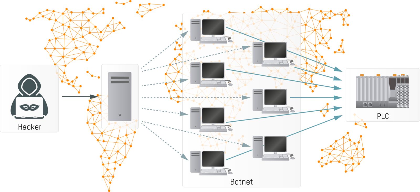 Les hackers peuvent paralyser des contrôleurs et donc des machines entières en provoquant une saturation du réseau. Ce type d'attaque est connu sous le nom d'attaque par déni de service distribué (DDoS). Un hacker envoie des programmes d'attaque appelés bots sur un plusieurs centaines d'ordinateurs, smartphones et tablettes, transformant ainsi ces derniers en outils d'attaque. Commandés à distance, les bots inondent ensuite un contrôleur de machine d'une multitude de requêtes simultanées, entraînant ainsi son arrêt et celui de la machine. Une attaque basée sur ce principe s'est d'ailleurs récemment produite chez un fabricant de microprocesseurs.