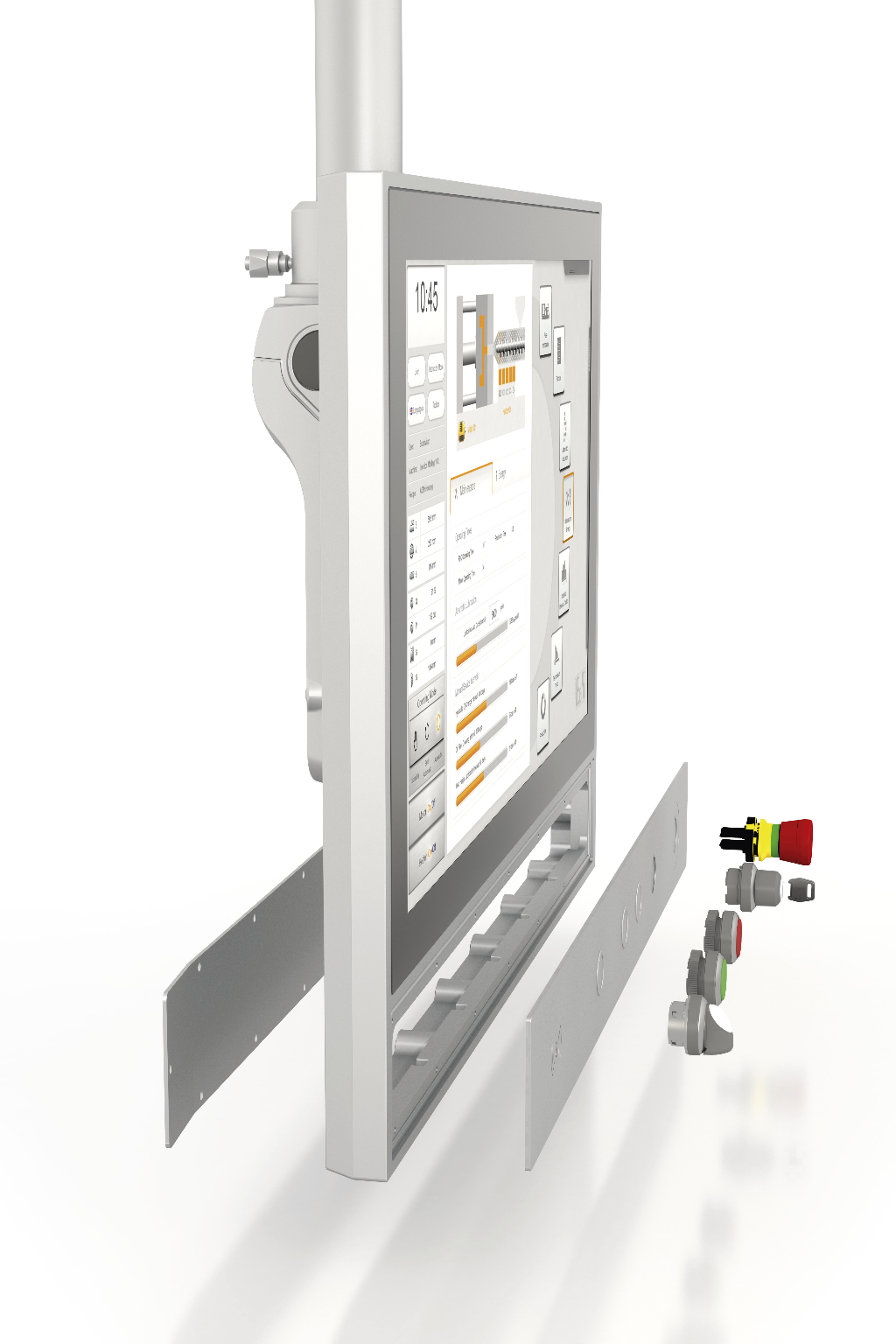 Touch screens open up a new world of possibilities for user interaction. Nevertheless, users continue to prefer mechanical elements for certain operations. That's why B&R offers its Automation Panel 5000 with optional push buttons, selector switches and key switches. An E-stop button can also be installed on the swing-arm device, where it is always within the operator's reach.