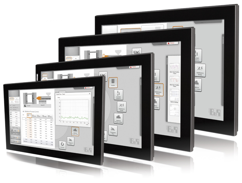 Il lato anteriore del Panel PC 900 è costituito da un touch screen capacitivo retro-proiettato di qualità superiore. La superficie interamente in vetro antiriflesso e il luminoso display ad alta risoluzione rappresentano il vertice della sofisticata tecnologia dei pannelli operativi. La nuova serie è disponibile con opzioni di montaggio negli appositi vani dei quadri elettrici o su bracci di supporto. I display sono dotati di una retroilluminazione a LED caratterizzata da lunga durata e risparmio energetico.