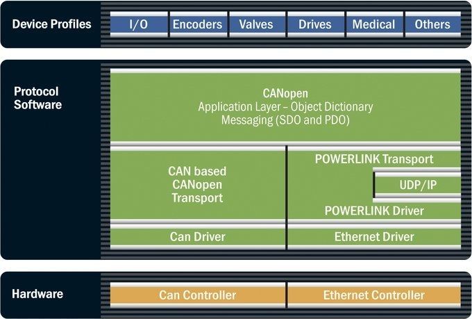 POWERLINK uses the same device description files as CANopen as well as the same object dictionaries and communication mechanisms, including process data objects (PDOs), service data objects (SDOs) and network management (NMT). As with CANopen, direct cross-traffic is also one of the essential features of POWERLINK. All CANopen applications and device profiles can be directly implemented in POWERLINK environments as well – the applications will not see a difference between the two protocols. For this reason, POWERLINK can also be referred to as "CANopen over Ethernet".