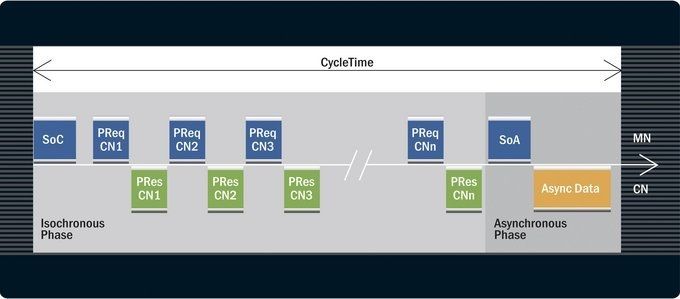POWERLINK networks use the following communication structure: one node – a PLC, motion controller or industrial PC, for example – is arbitrarily designated to function as the managing node (MN), which serves as the "moderator of the discussion". All other devices operate as controlled nodes (CN). The MN defines the clock pulse for synchronizing all devices and also manages the data communication cycle. Over the course of one cycle, the MN successively polls each CN using PollRequest messages that also convey additional data from the MN to each polled CN. Each CN then transmits its own data to all other nodes, this time via PollResponse messages. A POWERLINK cycle consists of three phases. In the first phase, the MN sends a "Start of Cycle" (SoC) frame to all CNs to synchronize the devices. Payload data is then exchanged in the second, or isochronous, phase. The third phase of a cycle is the asynchronous phase, which is where non-time-critical data such as TCP/IP data or parameter configuration data is transferred.