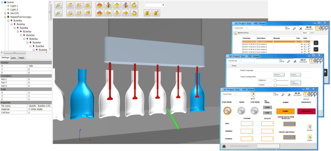 Rozwiązanie zakładające napełnianie w sposób ciągły (bez zatrzymywania taśmy produkcyjnej) wymusiło zastosowanie synchronizacji dla linii i systemu nalewaków. Poza napisaniem programu sterującego studenci stworzyli wizualizację w technologii VC4, korzystając przy tym z pakietu mapp Technology. Użyte komponenty to między innymi mapp Recipe, mapp AlarmX i mapp UserX. Aplikacja została przetestowana na fizycznym sprzęcie, a w celu zwizualizowania warunków przemysłowych posłużono się symulacją w Scene Viewerze.