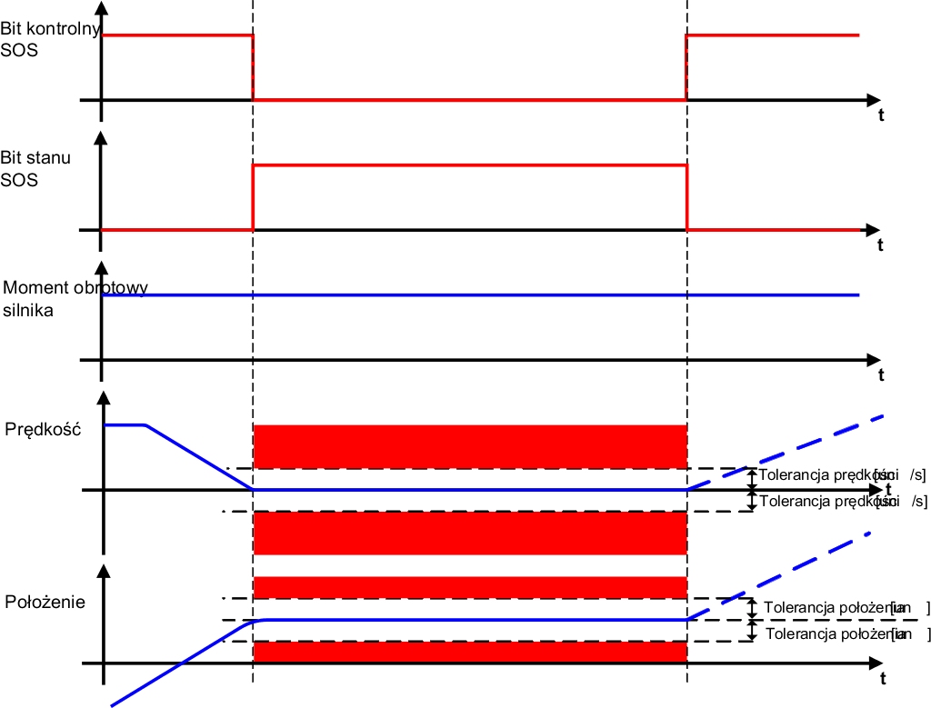 Safe Operating Stop (SOS) to stan, w którym napęd jest monitorowany pod kątem bezpiecznego zatrzymania. Napęd jest zasilany, dlatego można wygenerować moment obrotowy i siłę. Wszystkie funkcje sterowania między sterownikiem elektronicznym i silnikiem napędu są aktywne. Zatrzymanie osi jest monitorowane z zastosowaniem konfigurowalnego przedziału tolerancji zatrzymania. Monitorowane są zarówno położenie, jak i prędkość. Aby w bezpieczny sposób zebrać dane dot. prędkości i położenia, wymagany jest odpowiedni enkoder bezpieczeństwa. W przypadku przekroczenia wartości granicznych monitorowania zatrzymania, natychmiast uaktywniony zostaje bezpieczny impuls wyłączający, a napęd zostaje przełączony w stan błędu, co wymaga potwierdzenia.