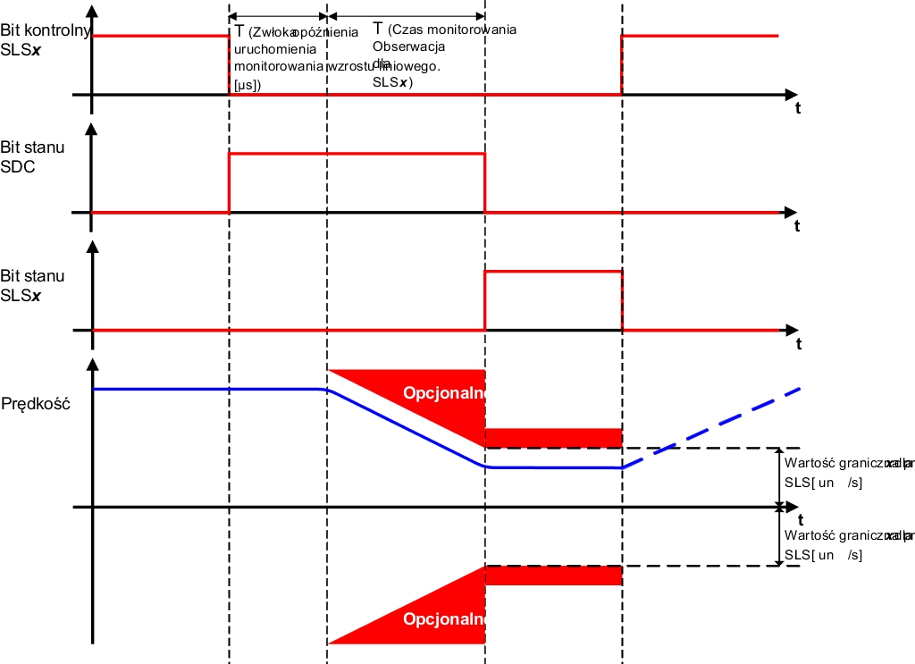 Funkcja bezpieczeństwa SLS monitoruje napęd, aby sprawdzić, czy nie zostały przekroczone konfigurowalne limity prędkości. Możliwe jest również monitorowanie hamowania, aż do osiągnięcia, w razie potrzeby, wartości granicznej przez aplikację. W zależności od wymagań, monitorowanie przyrostu liniowego hamowania można skonfigurować jako monitorowanie tylko okresu hamowania lub także monitorowanie liniowego przyrostu hamowania. W przypadku wykrycia przekroczenia w trakcie monitorowania przyrostu liniowego lub podczas monitorowania prędkości granicznej, natychmiast uaktywnione zostaje bezpieczne wyłączenie impulsowe i włączony zostaje stan błędu wymagający potwierdzenia.