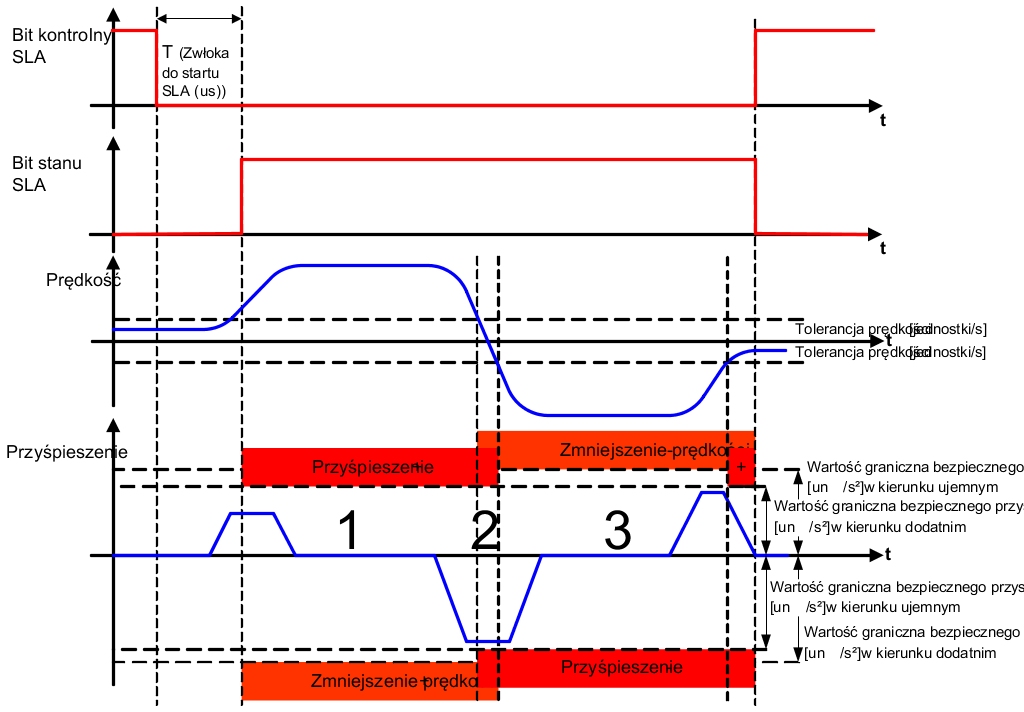 Funkcja bezpieczeństwa SLA jest używana do monitorowania przyspieszenia lub zmniejszenia prędkości w relacji do określonych maksymalnych wartości granicznych.
