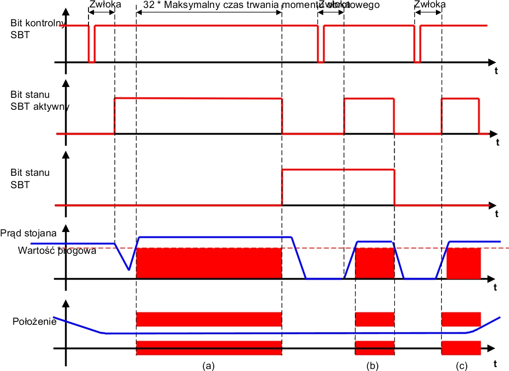 Funkcja bezpieczeństwa SBT nie jest funkcją konwencjonalną! Służy tylko do testowania włączonego hamulca wstrzymującego poprzez włączenie na pewien czas konfigurowalnego prądu stojana.