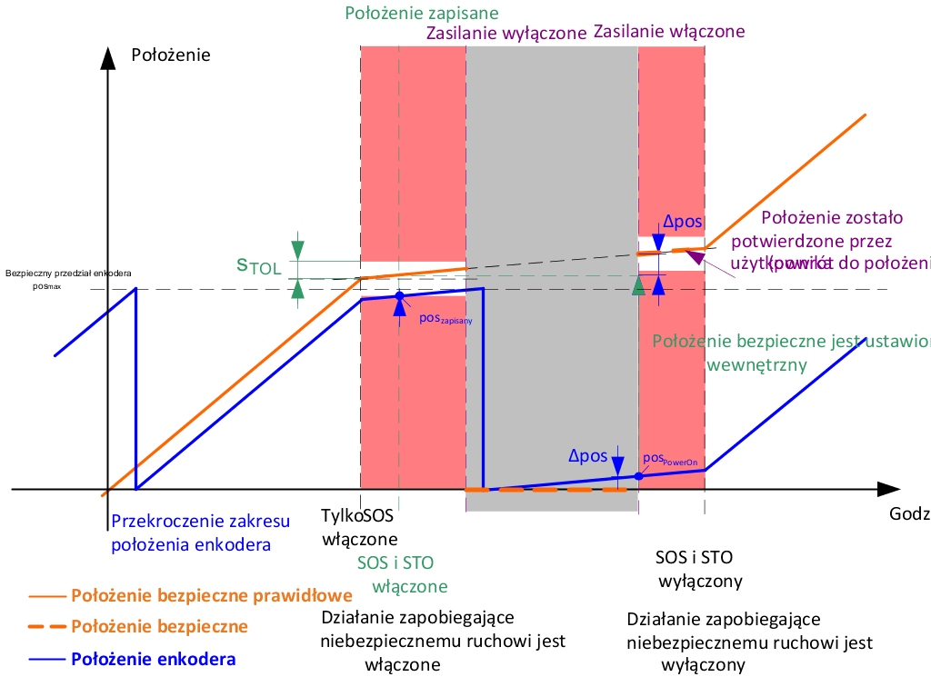 Dane prawidłowego położenia można zapisać w pamięci tylko po kontrolowanym zatrzymaniu napędu. Konieczne jest zatem zapewnienie doprowadzenie do zatrzymania. Należy również uniemożliwić zasilanie napędu podczas zapisywania danych, aby nie dopuścić do uruchomienia napędu. Wymagania te są spełnione w przypadku korzystania z funkcji bezpieczeństwa STO i SOS.
