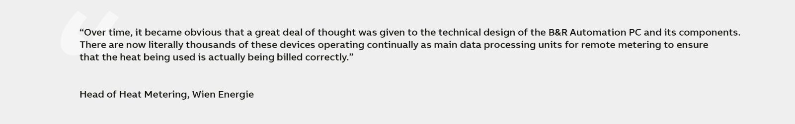 Automation PCs from B&R have been handling data acquisition and communication in the smart metering network for "Fernwärme Wien (district heating in Vienna)" since 2005. The hardware-specific PC drivers for meter communication are developed in-house, which required a reliable partner with clear product communication in the event of changes.