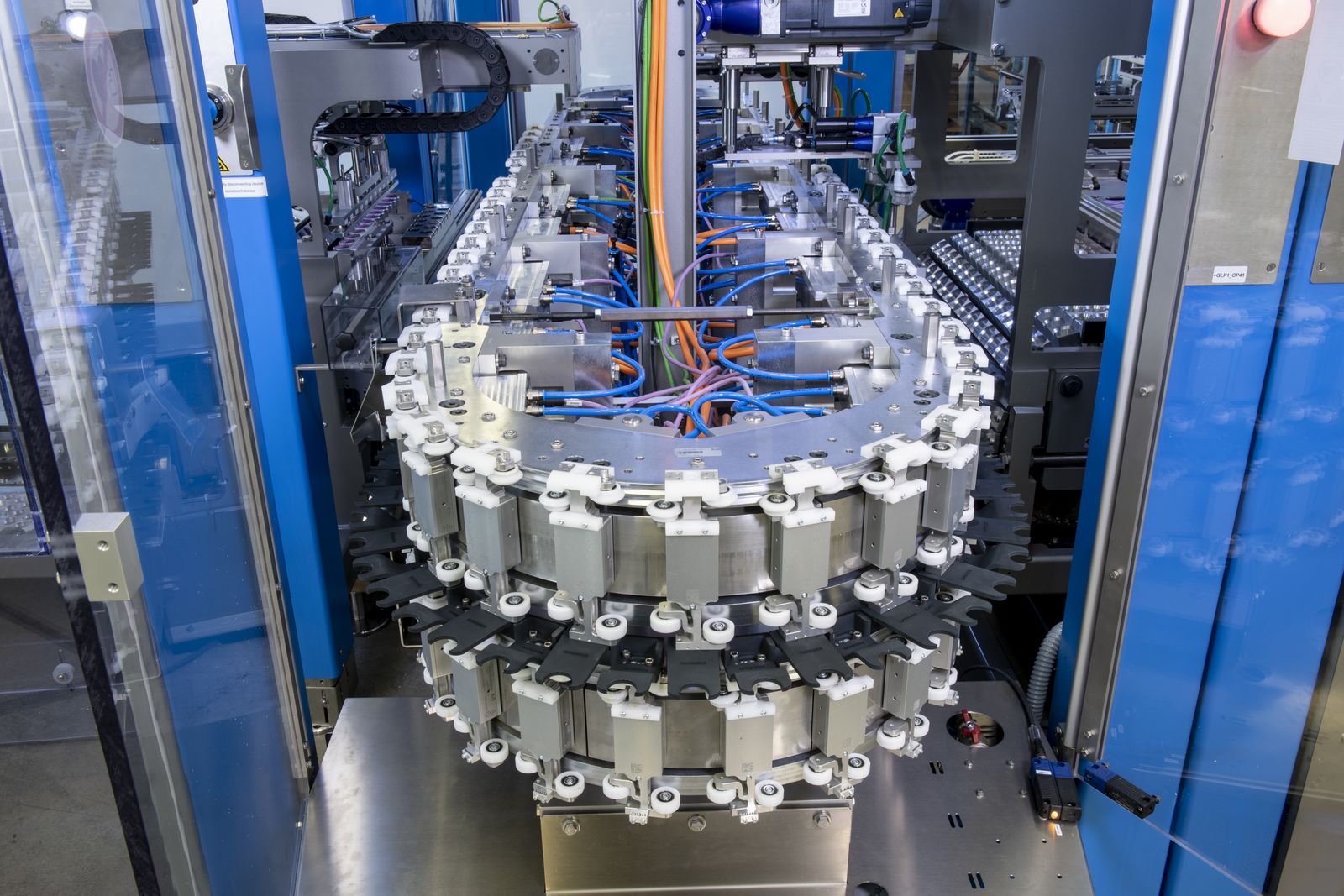 No entanto, atinge um rendimento maior do que sua contraparte convencional: o varejista de alimentos produz e embala 720 cápsulas em 72 caixas a cada minuto. Há um total de 80 transportadores em circulação. Eles são distribuídos em dois trilhos ovais separados e empilhados, cada um com 7,2 metros de comprimento.