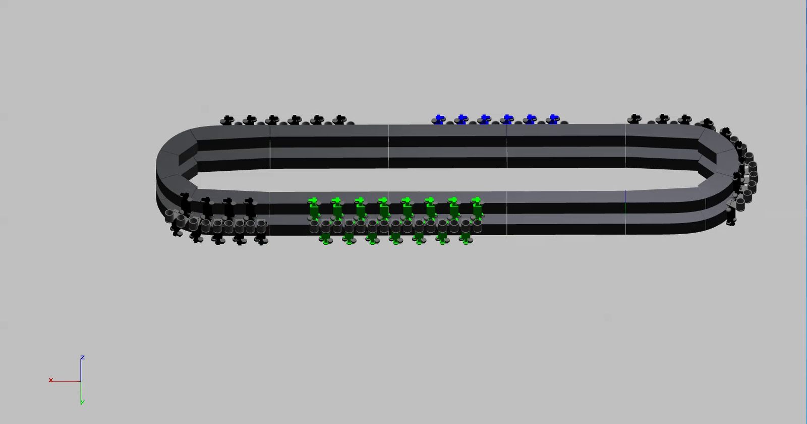 Um dos motivos para a divisão em dois trilhos foi o espaçamento necessário entre os produtos de menos de 50 mm, embora os próprios transportadores já tenham 50 mm de largura. Os trilhos em formato oval e os porta-produtos são, portanto, concebidos de modo que as garras do oval superior e as do oval inferior estejam localizadas alternadamente no mesmo nível. Nesse nível, os transportadores de produto têm cada um apenas cerca de 40 mm de largura, de modo que o espaçamento de produto necessário de menos de 50 mm pode ser alcançado.