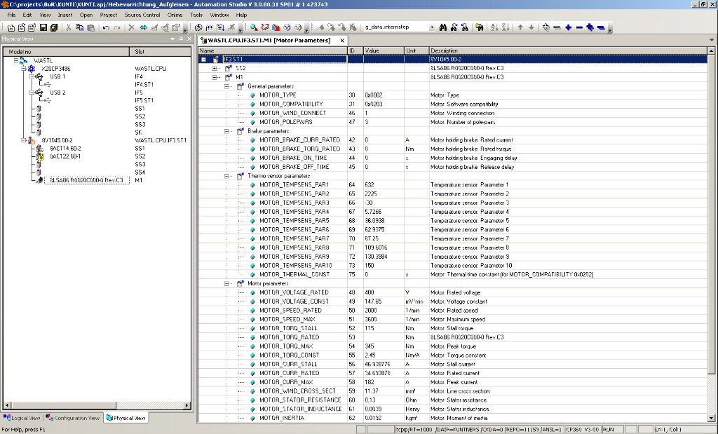 Chip de parâmetros incorporado Todas as informações mecânicas e eléctricas relevantes e dados são armazenadas no encoder EnDat, utilizado nos motores síncronos trifásicos 8LV. Isso significa que o usuário não tem que configurar parâmetros no servo drive em campo. Assim que o encoder é conectado ao servo drive e energia é aplicada a eletrônica, o motor é automaticamente identificado. O motor envia seus parâmetros nominais e seus parâmetros limites para o servo drive. O drive, em seguida, determina automaticamente os limites atuais e os parâmetros atuais de controle necessários para um controle otimizado do motor. O usuário apenas tem que otimizar os controladores de velocidade e posicionamento. O ambiente de "start-up" integrado no Automation Studio da B&R oferece suporte. Além do suporte durante o comissionamento, o trabalho de manutenção de rotina também é simplificado, e os motores podem ser substituídos sem a necessidade de tempo extra para a configuração de parâmetros.
