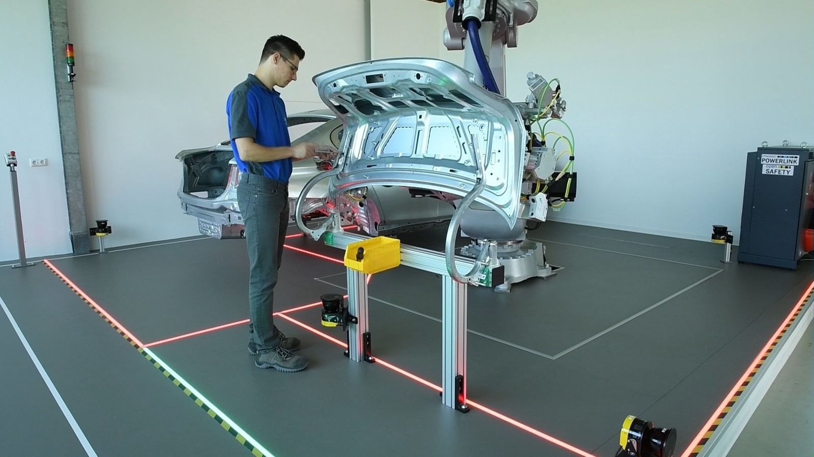 The scene is impressive to behold. A 2.7-meter-long robot with a maximum capacity of 220 kilograms transports the entire tailgate of a car to a mounting fixture, as EngRoTec engineer Sebastian Filk watches from behind a strip of red LEDs that marks the boundaries of his workstation. If he were to step over the boundary, the robot would stop within milliseconds or continue working at a sufficiently reduced speed to not endanger its human operator. As soon as Filk's "colleague of steel" comes to a stop, the lights change to green and he can safely enter. After fastening two hinges, he exits the area again and pushes a button on the next terminal to complete the work process. The robot then takes the pre-assembled tailgate to the body, positioning it with laser-guided precision. Once again, the green lights tell Filk the workpiece is in the right position and it is safe to enter. Even as he screws the tailgate onto the body, the controller is already busy sending quality data to the ERP system and requesting the next workpiece. In the future envisioned by Industry 4.0, this kind of intimate teamwork will soon become the norm.