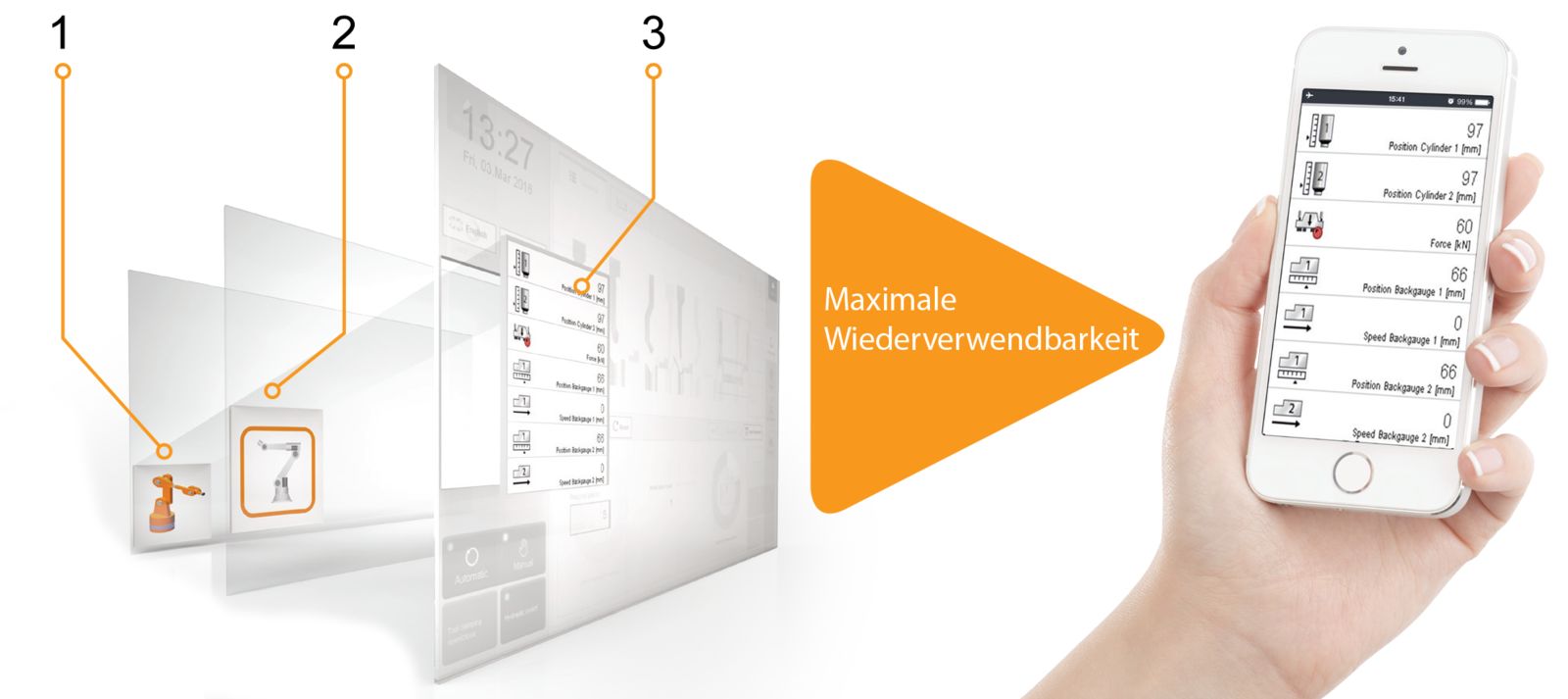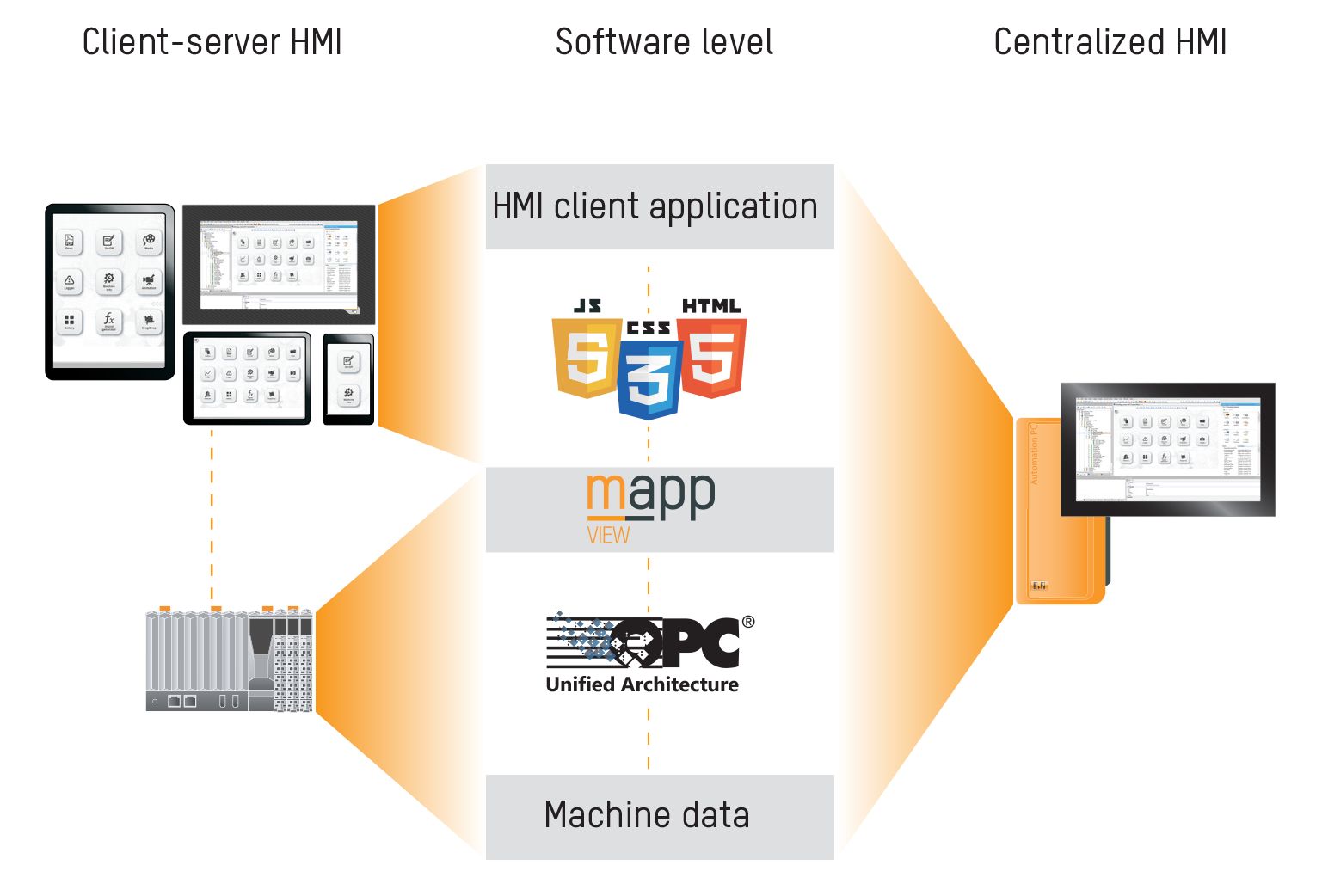 mapp View将内容和HMI逻辑从布局和控制逻辑中完全分离出来。这不仅减少了开发时间,而且还能最大限度地确保复用性,从而使mapp View成为实现模块化和柔性化机器设计的理想解决方案。