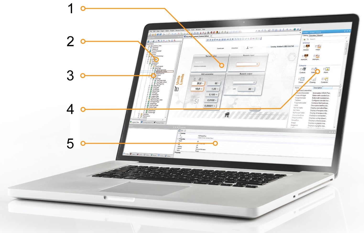 HMI项目是在贝加莱的开发环境Automation Studio中开发的。页面及其它资源在逻辑视图中进行管理。工具箱提供了所有可用小部件的完美概览。